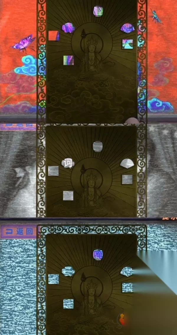 先拿出带孔的小卡片,果然菩萨后面的背景墙上的字会出现在小孔里面,记一下长方形=缘,云朵=赞,正方形=菩,灯笼=云,扇子=心,又一个正方形=无,因为有相似的图形,所以这个可能不是形状线索,把字亮起的顺序也记下来缘-心-无-云-赞-菩,这里其实是循环亮起的,所以第一个字不一定是缘只是记下顺序而已。