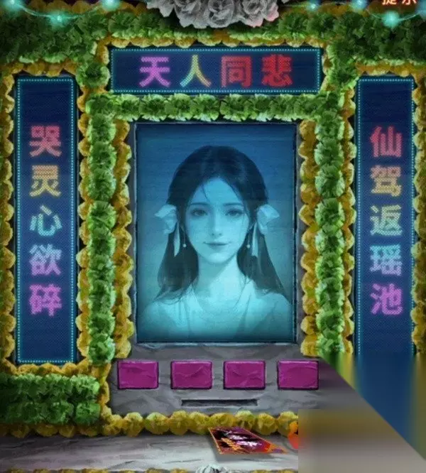 出门来到阴阳牢,先使用毛笔在桌子上登记一下吧,登记结束后从牢狱手中拿到女主照片,再次回到剧场,查看一下舞台上色彩斑斓的赛博灵台,点击照片最下面的那个花坛,花坛移动后出现四个按钮和一条缝,对那条缝放入女主照片后就可以开始调整了,第一个按键是中间照片,自然是调整为女主了。第二个按键是左边的对联,第四个按键是右边的对联,我们前面竹简上看到被上包围的字是仙,被下包围的字是碎,也就是左右对联必定有第一个字是仙和最后一个字是碎的,那么能用的对联也只有哭灵心欲碎和仙驾返瑶池了,竹简上被上下划红线的字是天和人,也就是最上面的横批要有天和人字,那么第三个按钮调整的上面只能是天人同悲了,调整好后如下图拿到入场券。