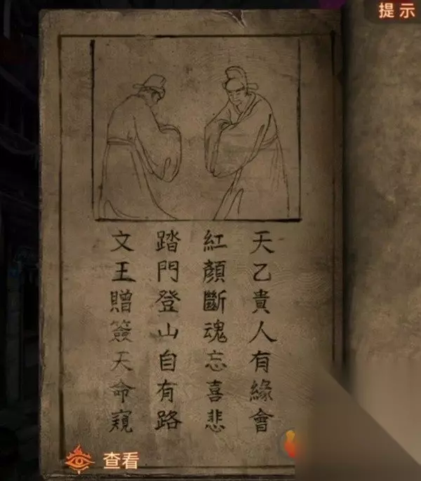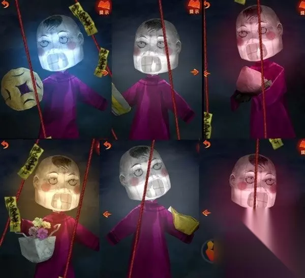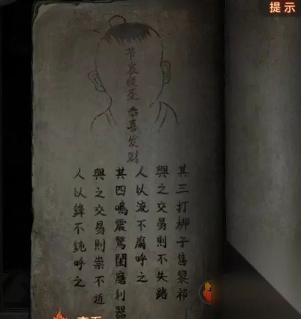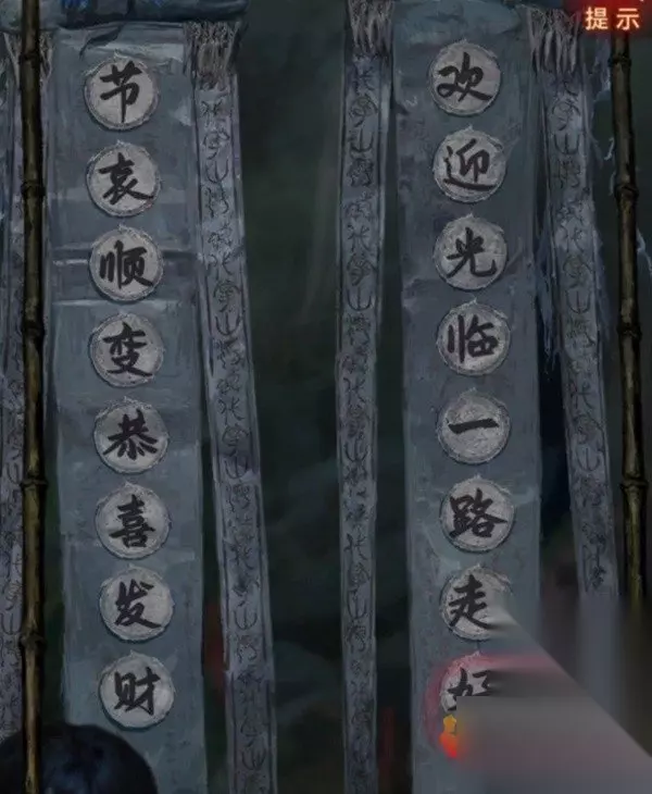 再查看一下左边八不郎,其实不是很重点,后面要用到的时候都会有对应提示的,第三页有个发髻小小的的小人,记下来脸上写的“节哀顺变恭喜发财”,那么我们现在白衣人的线索也齐了,回去调整,注意最下面露出来的头发对应对联位置哦,调整完毕之后白衣人也退散了。