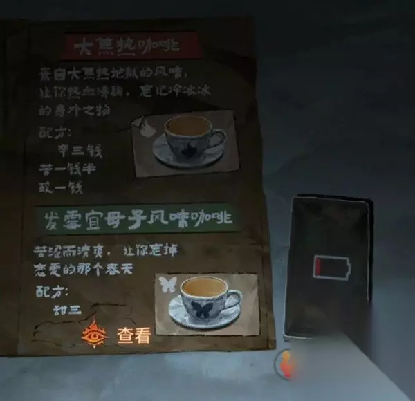 之后查看一下左上角的残书,这个是后面的线索暂时用不到,查看右边墙上wifi后获得手机,注意手机要在这里使用才能输入密码,不过我们暂时还不知道密码,注意一下密码提示马-纸钱-花圈-之。再查看一下桌子上能发现咖啡配方,记一下第一个的配方辛3,苦1.5,酸1.