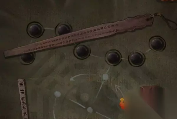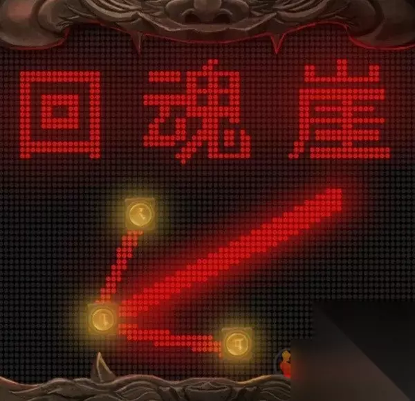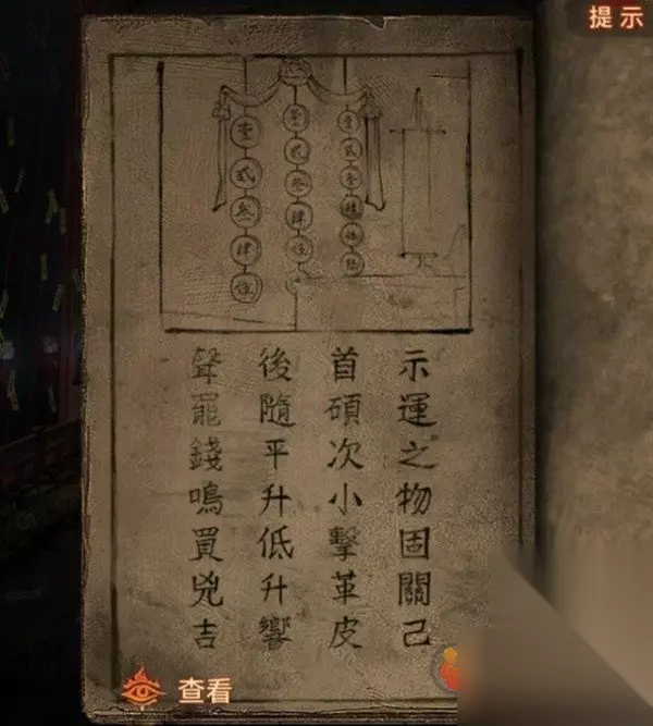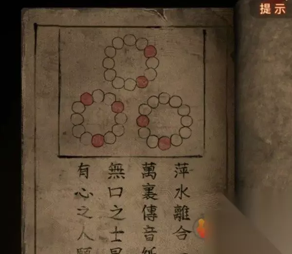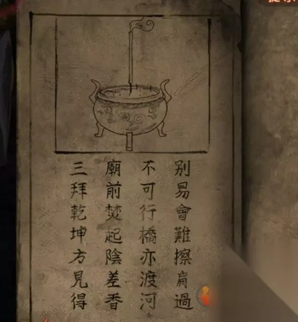此时翻看一下无字书又更新了,提示是要烧香了,先查看算命右边的门,将龟壳给装上去后调掉出三根香和一张纸条,纸条上是奇怪的图案,看起来是需要对照其他线索的,所以先后退来到右边的桥边,上桥对中间的纸使用花钱,会发现有8枚,和纸条上的圆圈数量相同。