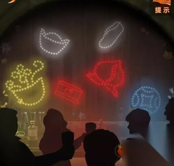 查看一家人左边的栏杆,发现有跳舞小人,上面挂着的挂穗还是不同颜色的,这个不就是广场舞姿势么?不过姿势的顺序和广场舞跳的顺序是一样的,也就是我们按照广场舞灯的颜色蓝黄红红白来调整就能完成了,完成后下面篮子拿到一辆小汽车。
