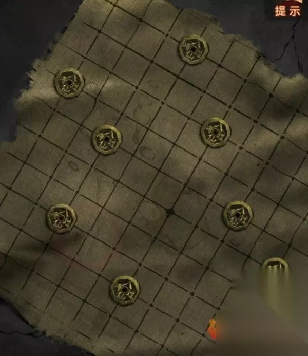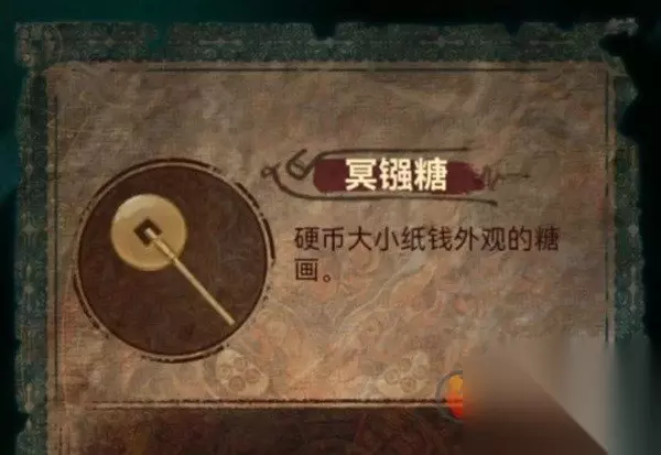 观察一下天上纷纷扬扬的纸钱,发现是有四种样式的,圆形纸钱上画的是莲花,桃形纸钱上画的是三个圈,方形纸钱上画的是元宝,元宝形纸钱上画的是桃子,记下来后查看左边的铜渔网,柱子上的图案不就对应纸钱图案了,调整一下拿到铜渔网。