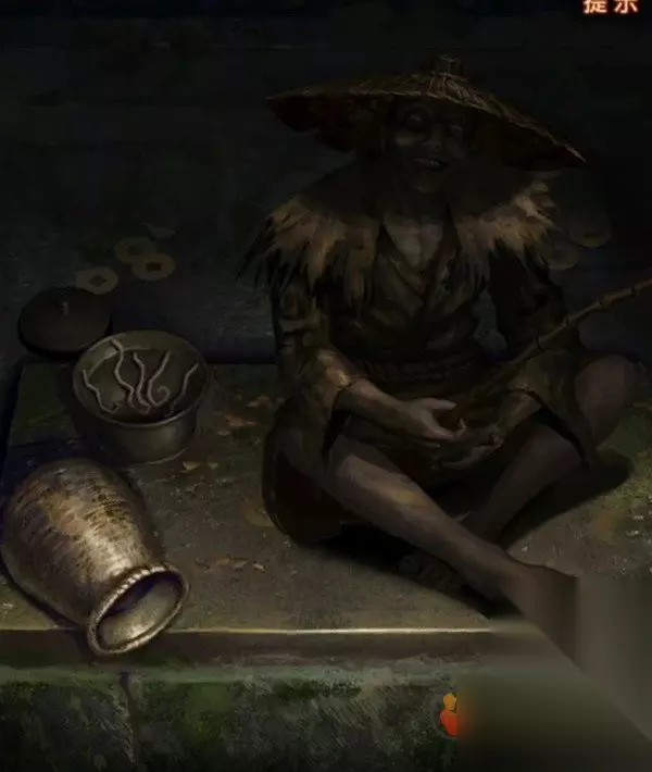 算了也不能和鬼计较,拿到后查看前面的队伍,虽然穿的喜庆但是他们可是抬棺材的,大概是管材里的等不及了竟然自己伸手出来讨要,注意看伸出来的袖子上的画是个饿死鬼,没看清的话点一下也是有提示的,所以把我们的纸灰泡水交给他,起码是特色小吃呢,他交给我们一枚古钱后就心满意足的走了。