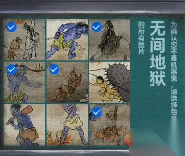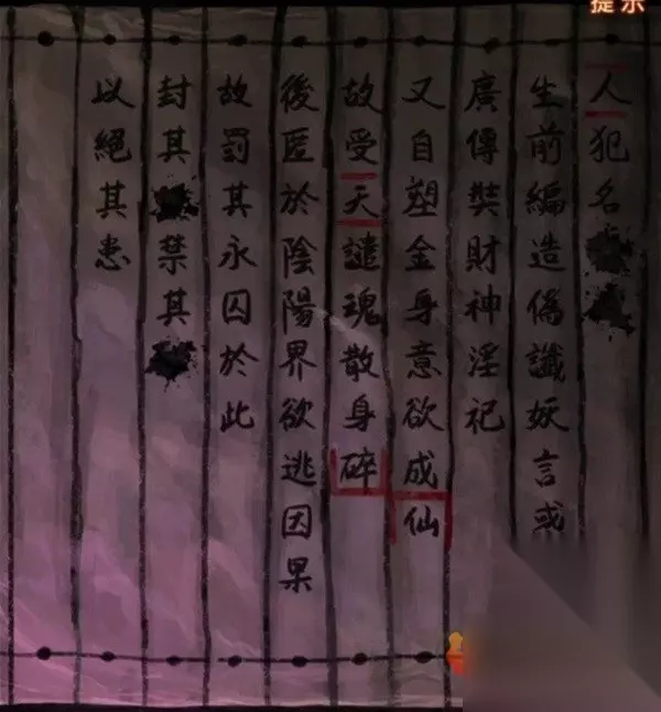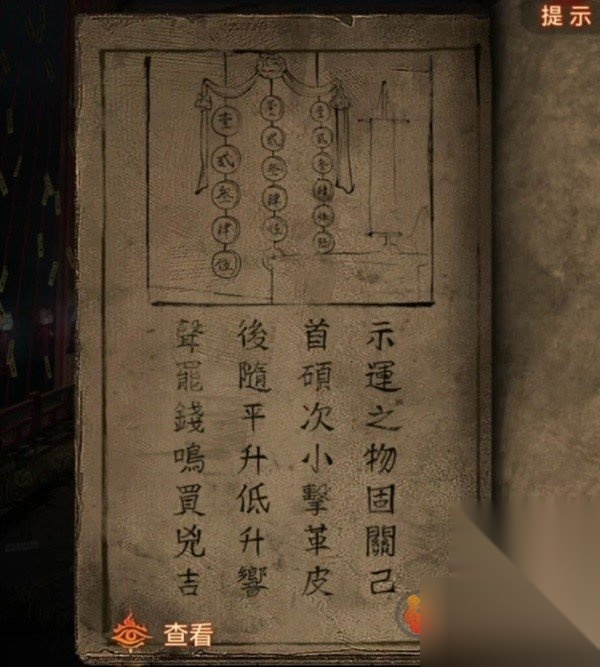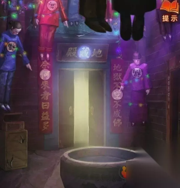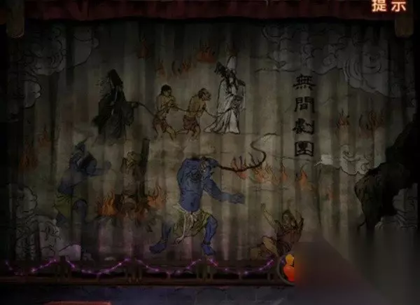 剧情结束之后幕布上出现地狱图,记一下上面出现的都有什么东西,有拉着人的黑白无常,在烧人的鬼和推倒人的鬼,再次回到音乐厅查看纸人机,上面写了可以买一赠一,但是需要填写验证码,将地狱图中出现的内容都选择一下点击验证拿到纸人头发。
