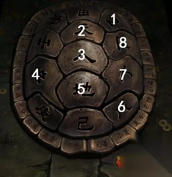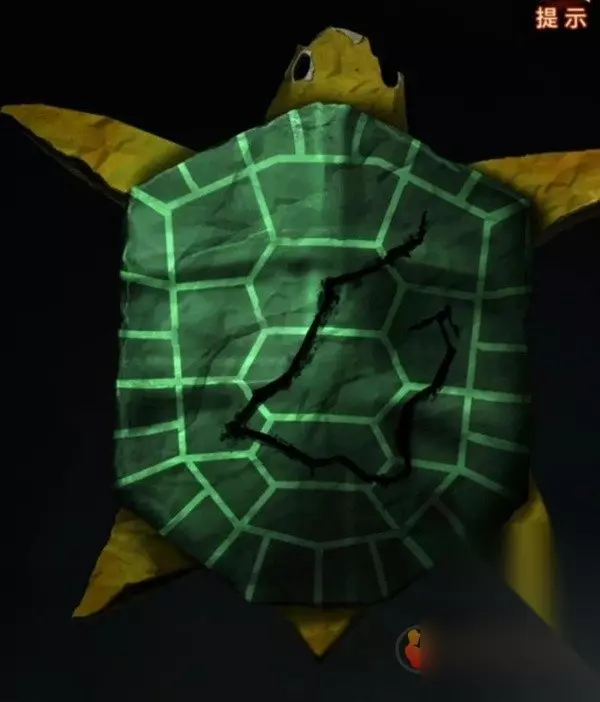 我们正好不知道该怎么敲龟壳,后退一下进算卦右边门,剧情后查看左边的乌龟,按照纸乌龟背上的裂痕点击龟壳,注意裂痕最右边是有个小箭头的,所以顺序就是乙天人辛地戊丁丙,点击完毕后龟壳下面掉出一张路引。