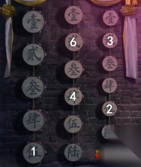 这个算是有点难度的谜题了,首先上面的图案很明显是算命左边的那个鼓,但是意思就很模糊了,第二句和第三句是提示,首硕次小,硕是大的意思,也就是先大再小,然后平升低升响,也就是平-上-下-上,我们现在手里的数字密码就是红光下的那个552472,先回到算命场景,对照左边的鼓查看一下数字。