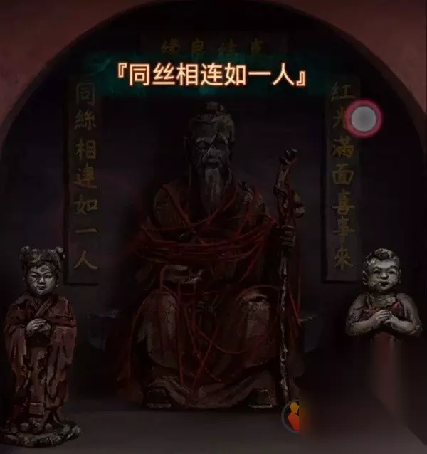 回到冰雪世界,将铁杯子交给八不郎获得女童子像,回到监控室查看左边的月老像,将两个童子像放在左右两边就能玩个小游戏,在蜘蛛头变大的时候点一下就行,主要是考手速难度不大,完成之后拿到一根红绳,不是说同丝相连如一人么,所以一个名额就能出去两个人了,玩的一手好消消乐。