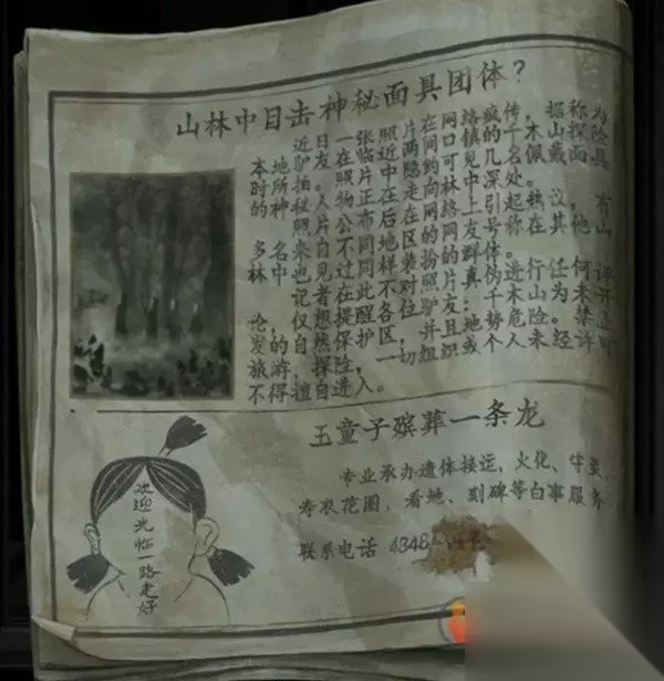 再次后退来到第一个场景,查看右边总伸手的纸人,使用电风扇给他直接吹飞起来,果然没有手来打搅我们了,查看一下他桌子上的书和报纸,线索在右边的报纸上,点击报纸翻到左边,下面有个小广告,小人扎了个小朝天辫,应该是右边的对联,记下来“欢迎光临一路走好”。