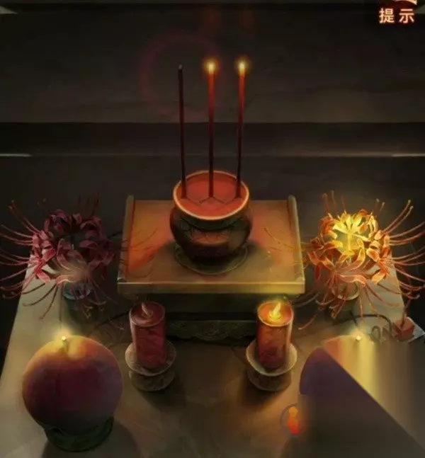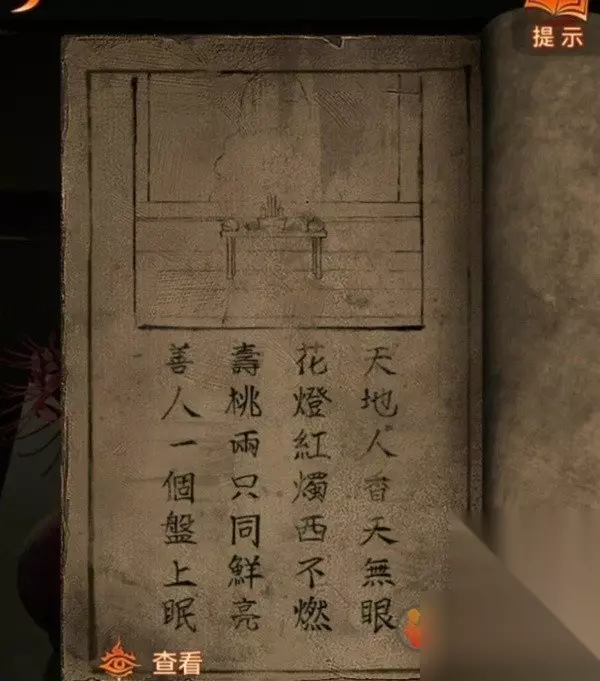 暂时没有更多线索,查看一下无字书吧,果然出现了线索,结合供桌上的东西理解一下,香叫天地人,那么天无眼就是天的那根香不要点亮,花灯和红烛西边的不点燃,一般来说上北下南左西右东,也就是左边的不亮,只点右边的,寿桃是两个都要亮的,调整一下供桌上的东西。