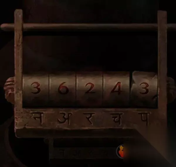 对大油锅使用夹子能拿到一块鸳鸯雕塑,然后后退来到转轮场景,查看右边的炉子,注意炉子上的线索和尺子上的鬼画符是不对应的,所以炉子的密码是36243,调整一下打开炉子拿到一块拼图,后退一下到冰冻场景,将拼图放在左上角的拼图上开始调整吧~调整完毕如下图,打开后的空间拿到梯子。