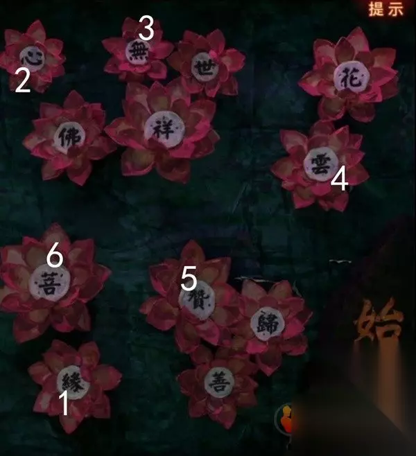 注意看完竹简会有小高能,这次进入刚刚打开的门到达剧场,中间位置的荷花上很多字很眼熟啊,我们前面获得过一个菩萨背后电子屏线索,荷花上面写了起于缘,所以就从缘开始,刚好米雪也是从缘开始记录的,顺序是缘心无云赞菩,点击完成后中间出现金色荷花,拿到一根木鱼棒。