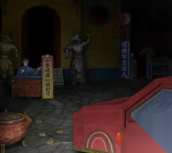后退一下来到停车场场景,数一下地上的纸钱有6枚,加上屋里的7枚现在有13枚了,记得大殿门口还有个马面雕像,这也算是马,所以马有7个,还有一个特别容易被漏掉的就是停车场里面还有个马,就在仅供车主出入的牌子右侧,所以最终马是有8只的记下来。