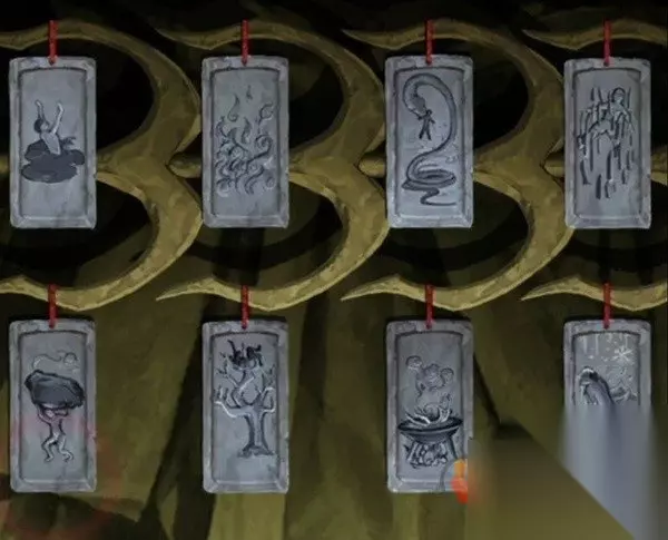 首先调整牌子上已经确定位置的三个,左上角是在水里的人,那么左下角肯定是关联的山,也就是抬着大石头的人。左边第二个下面是树,那么上面就是和树关联的火。右下角画了个雪花,也就是雪,所以上面是和雪关联的刀,这里和刀有关的就是刀山了。最后的蛇-锅只能放在第三个的位置上了,调整完毕后图片闪过两个雕像。