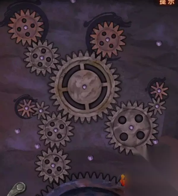 查看左边的箱子一样的东西,使用齿轮后可以开始调整,调整一下齿轮位置,注意大齿轮想要移动要先挪开旁边的小齿轮哦,黑色圈圈内的齿轮是无法移动位置的,调整到如下图,让所有齿轮都能转动起来就能开始木偶戏了。
