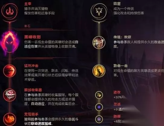 男刀的符文推荐点主系主宰,副系精密,符文碎片攻速、适应、魔抗。 主宰系的符文能进一步增加难道的爆发能力,黑暗收割在版本中的叠加伤害能力非常强,猛然冲击提供的穿透能力让男刀能更容易的打出收割性的效果,精密系的斩杀能力很强。 【出装推荐】