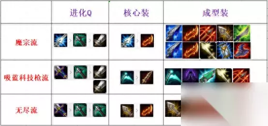 便于大家观看这里做了一个图,大家可以直接参考选择本局比赛最适用的出装方式。 三种出装方式利与弊 简单的来说就是AD路线AP路线和穿甲路线: AP路线的出装最大特点就是前期需要发育,一旦前期崩盘中期作用非常小,但是后续输出表现和击杀坦克表现出色,基本可以在25分钟就能进化玩Q W E三个技能并加持其他的核心装备,基本进入我们的节奏。 AD路线的出装最大特点与AP相反,前期的输出爆发非常高,尤其搭配上符文丛刃,前期崩盘也没关系,中期强化过的QE技能有一战之力,同样缺点后期输出不能与AP相媲美。其次就是W技能没有强化,所以开团前W技能Poke表现一般。 穿甲路线的出装最大特点就是CD和超级爆发,这个路线可以与AD路线相对比,毕竟这个路线的出装花费是最少的,收益也非常可观。重点就是前期进化Q技能的速度最快,可以立马进入我们的节奏。同AD路线一样后期打坦克表现完全不能与AP相比,算是一个快节奏滚雪球的出装方式。