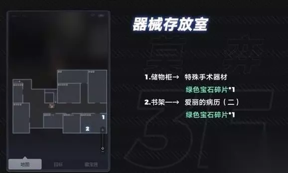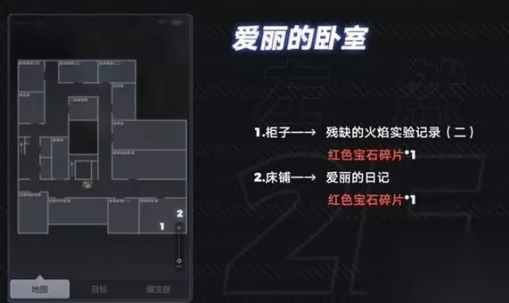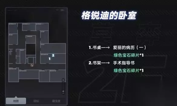 2楼: 1.爱丽的房间:左然 床上 下面的第三个长方形 2.格锐迪的房间:莫弈 书架上 道具:手术指导书 绿色宝石碎片 桌子上 道具:爱丽的病历(一)
