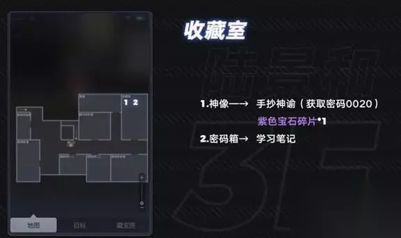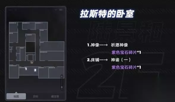 2楼:拉斯特的卧室 门旁边的神龛 道具:祈愿神像 紫色宝石碎片 床下边 道具:神谕(一) 紫色宝石碎片 3楼:收藏室 边的神龛 道具:手抄神谕 紫色宝石碎片 密码箱密码0020 ↓ 女雕像旁边的密码箱 道具:学习笔记 底下一层:祭祀厅 中间的血阵 道具:法阵的痕迹