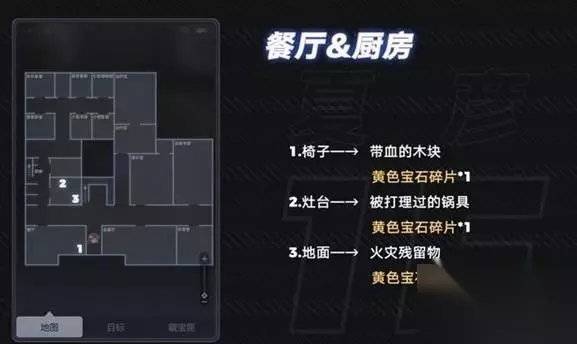 夏彦部分 1楼: 餐厅 道具:带血的木块 黄色宝石碎片 厨房: 地上 道具:火灾残留物 黄色宝石碎片 黑色的锅 道具:被打理过的锅具 黄色宝石碎片