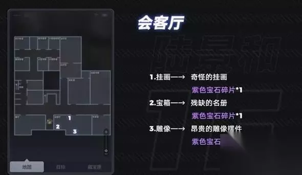 5.废弃卧室 底下一层 手术室:右上角的柜子 道具:试验病例报告 陆景和部分 1楼:会客厅 进门左边的画 道具:奇怪的挂画 紫色宝石碎片 进门的女雕像 道具:昂贵的雕刻摆件 紫色宝石碎片 最左边的箱子 道具:残缺的名册 紫色宝石碎片