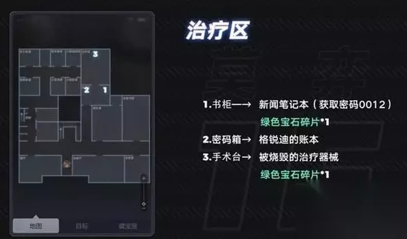 3楼: 1.画室:左然 边的箱子 最左边的画架 2.收藏室:陆景和 女雕像旁边有密码箱 边的神龛 3.器械存放处:莫弈 病床上 道具:爱丽的病历(二) 绿色宝石碎片 边的柜子 道具:特殊手术器材 绿色宝石碎片