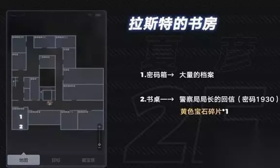 2楼:拉斯特的书房 书桌 道具:警察局长的回信 黄色宝石碎片 密码1930 ↓ 密码箱: 道具:大量的档案
