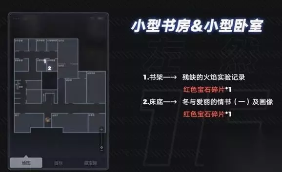 左然部分 1楼: 小型书房:右边的书架 道具:残缺的火焰实验记录(一) 红色宝石碎片 小型卧室:床底下 道具:冬与爱丽的情书(一) 红色宝石碎片 2楼:爱丽的房间 床上 道具:爱丽的日记 红色宝石碎片 下面的第三个长方形 道具:残缺的火焰实验记录(二) 红色宝石碎片(应该是有,我弟给我捣乱没有看见)