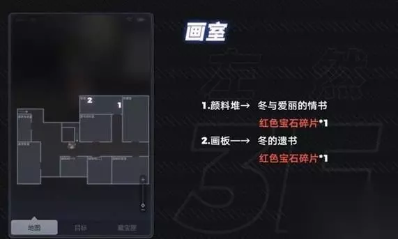 3楼:画室 边的箱子 道具:冬与爱丽的情书(二) 红色宝石碎片 最左边的画架 道具:冬的遗书 红包宝石碎片 底下一层: 地下防空洞 右上角的血迹 道具:爱丽的遗言