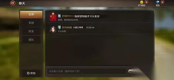 t15_2-t15_1:7.0 标签: 解锁 社交是网络游戏中必不可少的元素,聊天功能是属于社交元素中最为基本的。《坦克争锋》的聊天功能可以让玩家更好地沟通游戏技巧,增加游戏的可玩性。 聊天功能分世界、军团、好友、组队四大频道,在主界面点击【聊天】按钮进入世界聊天界面。当聊天室有消息时,在主界面聊天区域会显示最新的消息。以下是四大频道详情介绍。 1.世界频道 世界频道10级解锁,聊天内容全服人员均可见。当玩家等级未达到10级,可以看到其他玩家的聊天记录,但是自己无法发言。每日限制免费发言次数,如果超出发言次数则需要花费钻石。免费发言次数限制是为了防止聊天室刷屏严重,影响公屏的秩序。
