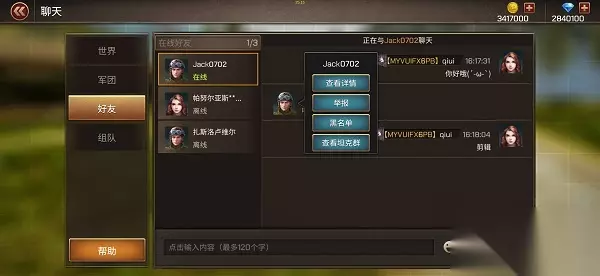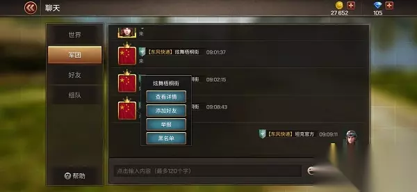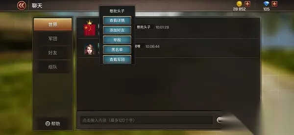 在【世界频道】界面,可以轻点玩家头像查看该玩家详情资料、查看军团、添加该玩家成为好友、对该玩家进行举报或者加入黑名单等操作。