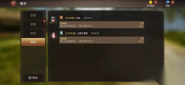 在【好友频道】界面,轻点玩家头像查看该玩家详情资料和军团、加入黑名单操作。 注:当有未读信息时,在好友列表会显示红色角标,提示玩家及时查看。 4.组队频道 组队频道1级解锁,聊天内容全服所有人均可见。组队频道是玩家发送邀请其他玩家一起战斗的场所,可以一起练技术、比拼、开启团队赛。 在【组队频道】界面,玩家只可以加入组队房间,无法进行发言。玩家可以在【主界面】-【模式选择界面】中,点击常规模式、天梯模式、活动模式任意面板,点击【组队加入】按钮创建组队房间,点击【组队喊话】按钮进行编辑邀请信息,点击【发送】按钮将组队房间信息发送至组队频道,这样其他玩家就能在【组队频道】界面看到该房间请求信息。