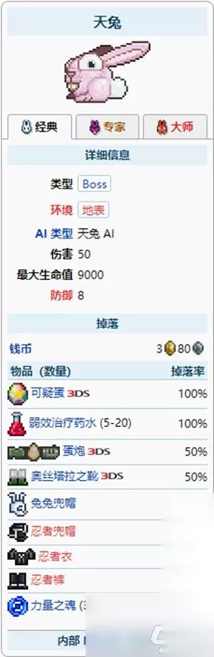 泰拉瑞亚天兔怎么召唤?在泰拉瑞亚中,有着许多的boss,有自然生成的,也有需要召唤才会生成的,还有就是事件中特有的boss等等。天兔是泰拉瑞亚中一个比较特殊的boss,是需要在现实世界中的复活节期间才能够进行召唤的一个boss。那么天兔具体该如何召唤呢?下面就让小编为各位介绍一下天兔的召唤方法吧。 天兔召唤方法 天兔是一个大型兔子 Boss。它可以用复活节期间腐化兔和病兔掉落的可疑蛋召唤。在召唤后,会显示讯息“天兔已苏醒!”。天兔可以在一天中的任意时间生成。 一开始,天兔会慢慢向前走,偶尔转身面对玩家。过一会后,它会短暂站住不动,生下一个天兔蛋,然后快速跳向玩家。