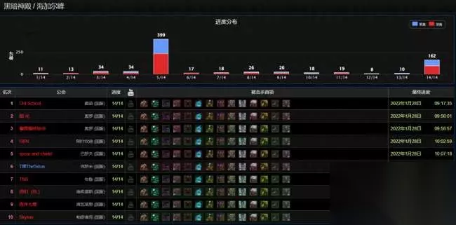 P3开放仅8个小时,目前已经有162个国服团队全通了T6双本,而全球全通团队为411个。大家注意看这个团队进度分布图,可以看到过了阿克蒙德和伊利丹的团队数量占据90%,卡在小BOSS的团队寥寥无几,这也从侧面证明这两个副本确实简单,基本上只要去打就能全通。