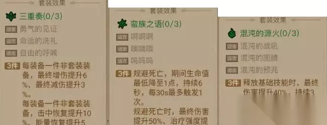 二、首饰套装 1. 三重奏 (散件流派) 套装效果: 大幅提升非套装装备的攻防属性(270%),击中回复(90%),能量恢复(45%)。 适用流派: 喜欢搭配散件装备,追求极致属性提升的玩家。 2. 蛮族之语 (高压生存流派) 套装效果: 每30秒触发一次规避效果,生命值不会低于1点,提升最终伤害(50%)和治疗强度(30%)。 适用流派: 需要在高压环境下生存的玩家。 3. 混沌的源火 (持续输出流派) 套装效果: 提升最终伤害和能量回复(40%),易于实现全程覆盖。 适用流派: 需要持续输出和能量回复的玩家。