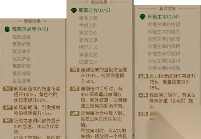 暗能套装选择建议: 选择时需根据自身流派和技能符文搭配考虑。 一、核心技能套装 1. 荒芜灭战者 (旋风斩流派) 强化技能: 旋风斩 两件套: 提升旋风斩直接伤害。 四件套: 增强旋风斩附加伤害和投射物效果。 六件套: 强化狂战之怒终极技能,回复能量,实现旋风斩多次释放。 适用流派: 以旋风斩为主要输出手段的玩家。 2. 原罪之伐 (流血流派) 强化技能: 痛割 两件套: 痛割直接伤害提升100%,持续伤害提升50%。 四件套: 增加血涌效果,额外触发一次流血伤害。 六件套: 增强穿刺终极技能,每次命中回复25%已损失生命值。 适用流派: 依赖痛割技能造成流血伤害的玩家。 3. 永恒主宰 (原力锤流派) 强化技能: 原力锤 两件套: 原力锤伤害提升75%,能量恢复提升15%。 四件套: 触发多重施法,大幅提升单次伤害。 六件套: 提升蛮灵继承属性,增强友方单位最终伤害和减伤。 适用流派: 以原力锤进行控制或单体输出的玩家。