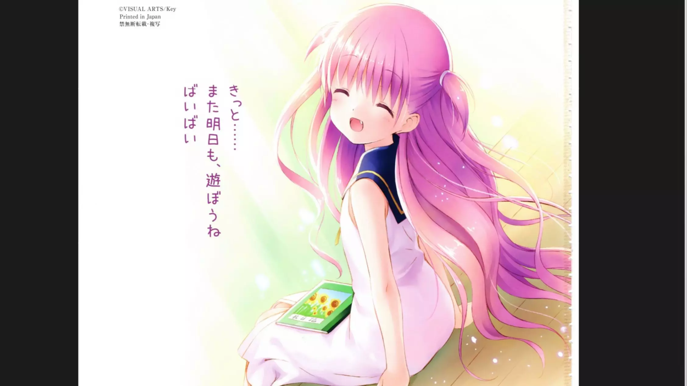 这究竞已经是第几个夏天了呢。 我也早就懒得去数了,感觉应该已经过去很多个了。 世界上,有很多事并不尽如人意。 自己越是拼命伸出手来,所盼望的就越是离我而去。 每当我挥动翅膀,就会有什么在风中飘落。 来到那么远的地方,究竟是为了得到些什么呢。 只不过…… 是为了和那个人,度过一个快乐的暑假吧。 没错,就只是这样而已。 这就是我那一点点小小的愿望。 是的……对普通人来说那一定是理所当然的事情吧。 但是对我来说,那却太过耀眼了。 那是无论希望也好,祈求也好,都没法传递出去的东西…… 越是飘落,“我”就会越朝着我的方向改变,而我也会渐渐变得不再是“我”。 但无论如何,它们最后也会变成“我”吧。 凝聚成一片含有所有的记忆与回忆的羽毛。 ……哪怕,就一次也好。 请给“我”美好的回忆吧。 请让我,能够自豪地说出—— 在这个最后的暑假里……我过得,很开心吧……
