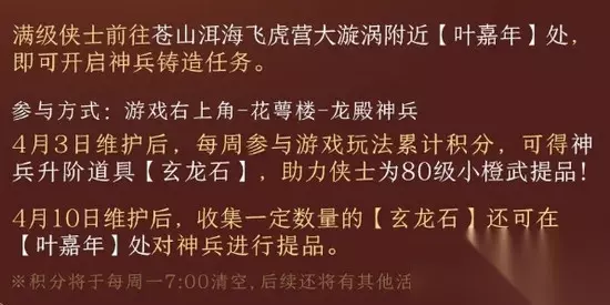 80级小橙武任务在哪接 1.需达到满级80级才可接任务。 2.满级侠士前往苍山洱海飞虎营大漩涡附近找【叶嘉年】对话,接任务,开启神兵铸造任务,NPC位置如下: