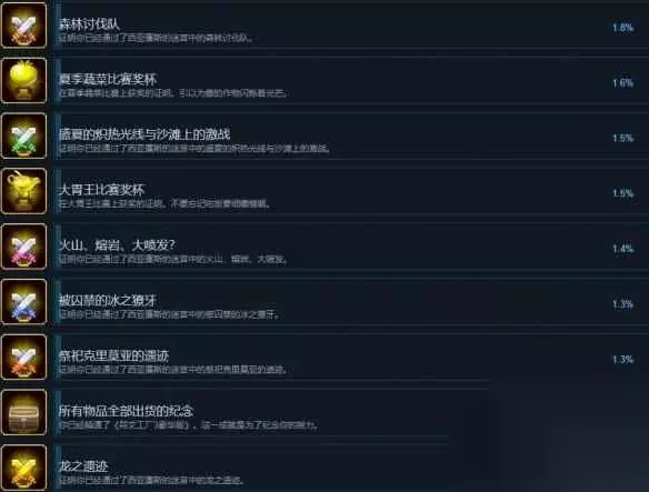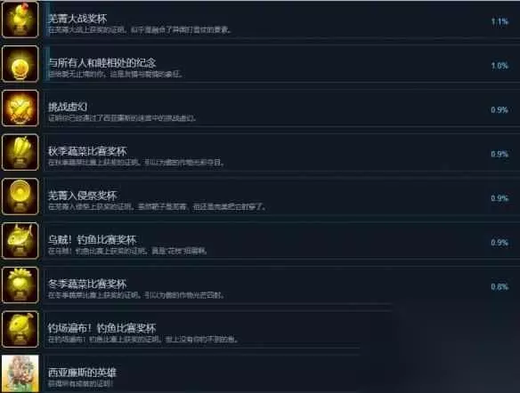 ASe 夏季蔬菜比赛奖杯ASe 解锁条件:在夏季蔬菜比赛上获奖的证明。引以为傲的作物闪烁着光芒。ASe 盛夏的炽热光线与沙滩上的激战ASe 解锁条件:证明你已经通过了西亚廉斯的迷宫中的盛夏的炽热光线与沙滩上的激战。ASe 大胃王比赛奖杯ASe 解锁条件:在大胃王比赛上获奖的证明。不要忘记吃饭要细嚼慢咽。ASe 火山、熔岩、大喷发?ASe 解锁条件:证明你已经通过了西亚廉斯的迷宫中的火山、熔岩、大喷发。ASe 被囚禁的冰之獠牙ASe 解锁条件:证明你已经通过了西亚廉斯的迷宫中的被囚禁的冰之獠牙。ASe 祭祀克里莫亚的遗迹ASe 解锁条件:证明你已经通过了西亚廉斯的迷宫中的祭祀克里莫亚的遗迹。ASe