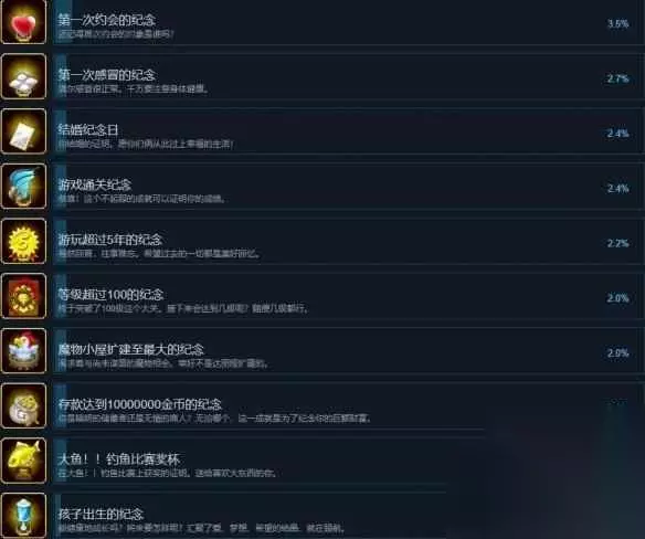 ASe 游戏通关纪念ASe 解锁条件:恭喜!这个不起眼的成就可以证明你的成绩。ASe 游玩超过5年的纪念ASe 解锁条件:蓦然回首,往事难忘。希望过去的一切都是美好回忆。ASe 等级超过100的纪念ASe 解锁条件:终于突破了100级这个大关。接下来会达到几级呢?随便几级都行。ASe 魔物小屋扩建至最大的纪念ASe 解锁条件:渴求着与尚未谋面的魔物相会。幸好不是达丽娅扩建的。ASe 存款达到10000000金币的纪念ASe 解锁条件:你是精明的储蓄者还是无情的商人?无论哪个,这一成就是为了纪念你的巨额财富。ASe 大鱼!!钓鱼比赛奖杯ASe 解锁条件:在大鱼!!钓鱼比赛上获奖的证明。送给喜欢大东西的你。ASe 孩子出生的纪念ASe 解锁条件:能健康地成长吗?将来要怎样呢?汇聚了爱、梦想、希望的结晶,就在眼前。ASe 森林讨伐队ASe 解锁条件:证明你已经通过了西亚廉斯的迷宫中的森林讨伐队。ASe