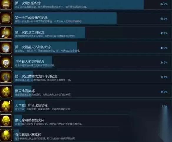 ASe 撒豆比赛奖杯ASe 解锁条件:在撒豆比赛上获奖的证明。为什么失败之作会飞过来呢?ASe 大丰收!钓鱼比赛奖杯ASe 解锁条件:在大丰收!钓鱼比赛上获奖的证明。钓鱼钓不停的证明。ASe 摩可摩可感谢祭奖杯ASe 解锁条件:在摩可摩可感谢祭上获奖的证明。想把自己埋在巨大的摩可摩可里。ASe 春季蔬菜比赛奖杯ASe 解锁条件:在春季蔬菜比赛上获奖的证明。引以为傲的作物闪耀着光辉。ASe 第一次约会的纪念ASe 解锁条件:还记得首次约会的对象是谁吗?ASe 第一次感冒的纪念ASe 解锁条件:偶尔感冒很正常。千万要注意身体健康。ASe 结婚纪念日ASe 解锁条件:你结婚的证明。愿你们俩从此过上幸福的生活!ASe
