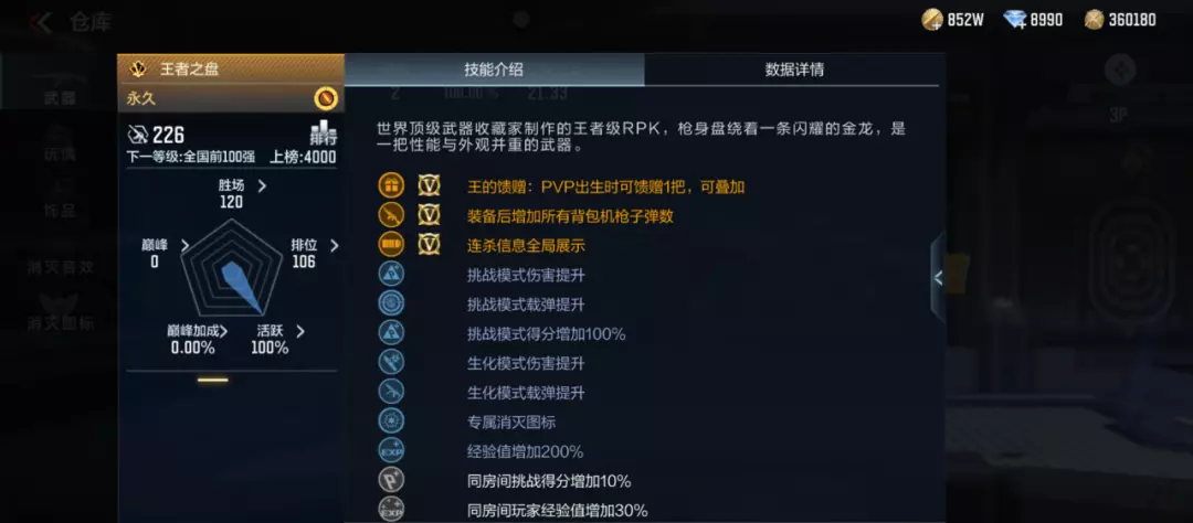 王者之盘可谓一把全能机枪。在竞技模式中,600发/分的射速不算快,但是也不慢,甚至可以让机枪比较好操控;32点基础伤害加上无距衰,应用面很广;精度与稳定性的提升进一步提升操控性。