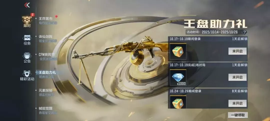 王盘登录礼活动分为两个部分,在10.17-10.19期间与10.24-10.26期间分别完成登录与指定数量的对局即可领取奖励。