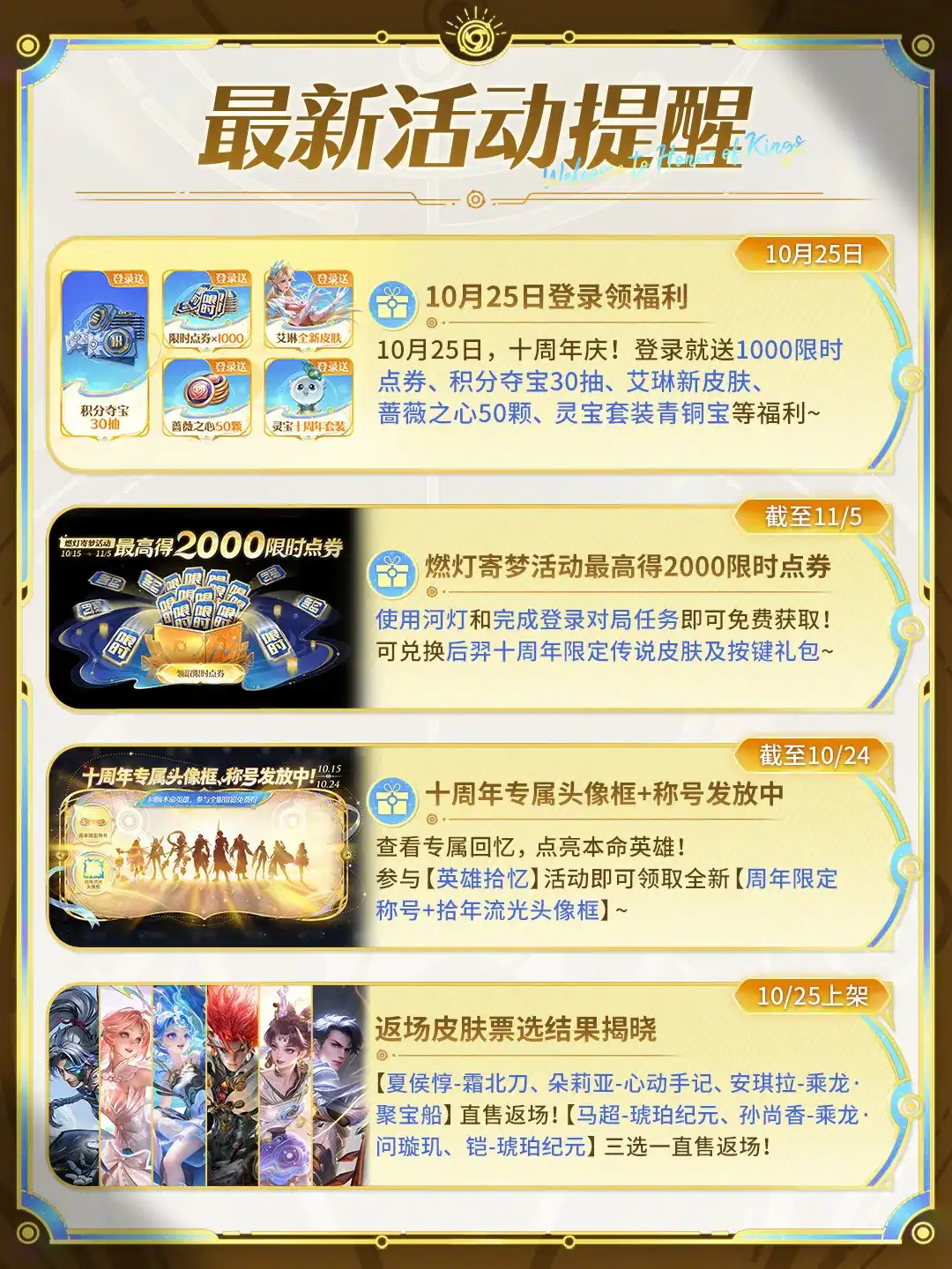 十周年返场皮肤票选结果揭晓!10月25日【夏侯惇-霜北刀、朵莉亚-心动手记、安琪拉-乘龙·聚宝船】直售返场!【马超-琥珀纪元、孙尚香-乘龙·问璇玑、铠-琥珀纪元】限时直售3选1!