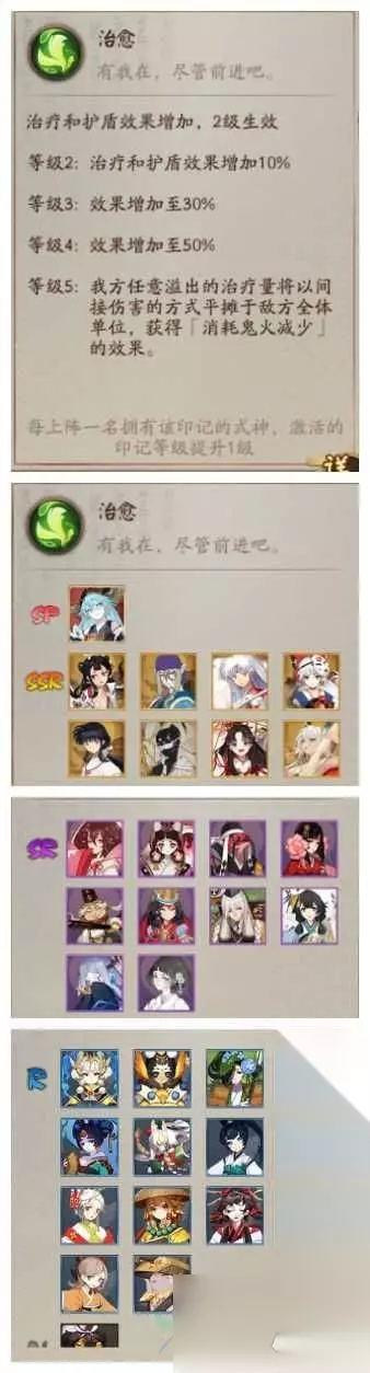 阵型引荐二:5治好人物 人物引荐:sp金鱼姬,云外镜,紧那罗,日和坊,童女,天井下,蝴蝶精 印记引荐: 疾风,祝愿buff选生命加成。