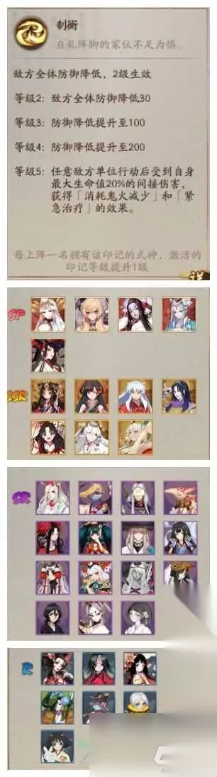 阴阳师轮回之庭阵型引荐 阵型引荐一:5制衡+肉式神的部队 制衡人物:sp彼岸花+辉夜姬+鲤鱼精+跳跳弟弟/哥哥+紧那罗 御魂引荐: 制衡人物引荐使用地藏、雉魂以及伤魂鸟等能抗的式神,避免对方把自己炸死。 印记引荐: 其他印记可所以治好和处刑,祝愿buff挑选生命加成。