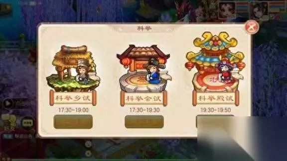科举考试时间:周六17:30-19:50 人数限制:只限单人 等级限制:最低30级 活动描述:每周一次的答题活动,有丰厚的经验奖励和稀有称号奖励。科举需要先进行乡试,乡试晋级后进入会试阶段,会试通过后才可参加殿试。其中,乡试、会试均为二十道题,殿试为十道题。题型都是在日常答题的题库中随机抽取的哦!殿试结束后,根据答题的用时进行排名,获得金锭以及称号奖励。