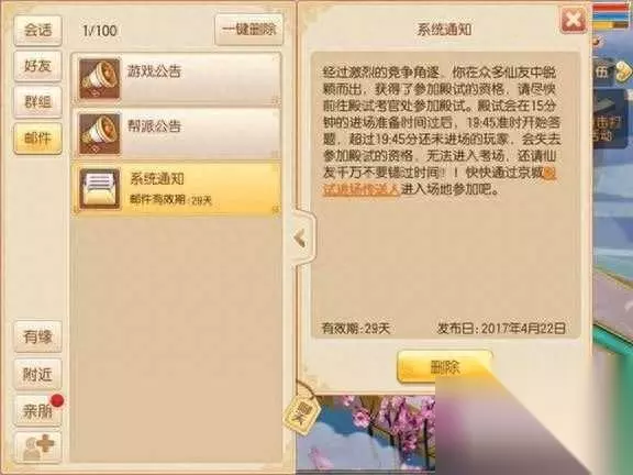 晋级条件: 乡试:只要等级达到30级以上,均可参加乡试。 会试:在乡试中答对十道题以上即可晋升会试。进入会试就意味着你已经踏入了殿试的门槛,会试的评判标准是用时越短越优秀。 殿试:会试考生中排名前100的玩家才可参加,是科举考试中的重要环节,是否能春风得意,笑看天下,均在此一役。 进入殿试的考生在19:30的时候会收到邮件通知,点击邮件中的进入殿试,即可自动寻路到考官处,进行入场。