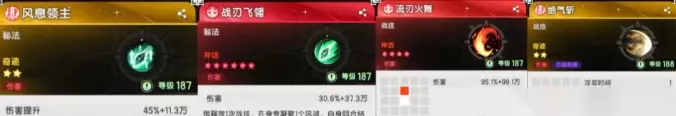 3.元素流 战技上,火焰随身的保质期很长,品质高可以一直用,而剑风狂舞和流刃火舞也不必多说,都是四转的输出支柱。 五转新技能炎阳风暴虽然被砍了一刀,但表现依旧不错,品质高也很好用。 被动则选择暴击暴伤+强袭+极速对决,在暴击足够后,可以把洞察心眼换成红莲战意。这个玩法适合四转强袭抽的比较高的玩家。