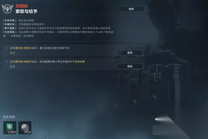 第二个改动的任务是索取与给予。这个任务需要玩家自己杀两个人,并且还需要带出6个狗牌。这里面可以让队友进入之后直接撤,这个任务最大的改动不是提交而是需要带出,这点对于不少玩家来说都比较麻烦。